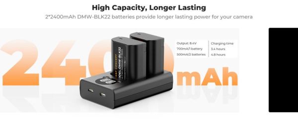 2400mAh erős akkumulátor kapacitás: K&F Concept DMW-BLK22 akkumulátor 2400mAh 7.4V, 17.76Wh kapacitással, amely alkalmas hosszú távú fotózáshoz.