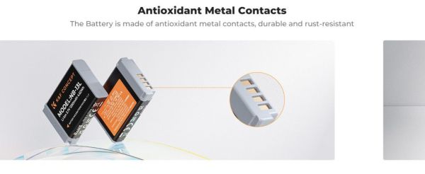 2 db akkumulátor a hosszabb élettartamért: K&F Concept NB-13L akkumulátor 1250mAh 3.7V 4.5Wh kapacitással, amely alkalmas hosszú távú fotózáshoz.