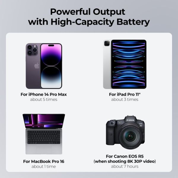Több Port: Ez a V-Mount akkumulátorcella USB-C, USB-A, BP és D-TAP portokkal rendelkezik. Támogatja több eszköz egyidejű töltését: DSLR fényképezőgépek, videokamerák, monitorok, okostelefonok, táblagépek és laptopok stb.