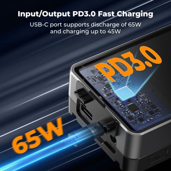 - Gyors, kétirányú PD töltés: Támogatja a PD3.0/2.0 gyorstöltési protokollokat. Az USB-C porton keresztül akár 65W teljesítménnyel tölthető, a töltési teljesítmény pedig elérheti a 45W-ot. Teljes feltöltés kevesebb mint 2 óra alatt.