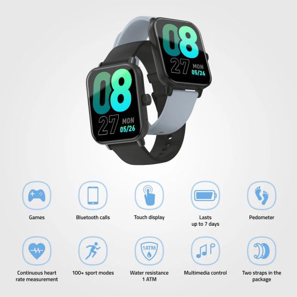 Smartwatch Bluetooth-hívással, SMS-vétellel, alkalmazás-értesítésekkel, médiavezérléssel, egészségkövetéssel, lépésszámlálóval, sportmódokkal, alvás- és ciklusfigyeléssel, 7 napos akkumulátorral, testreszabható óralappal, időjárás-frissítésekkel, távoli kameraindítással és játékokkal.