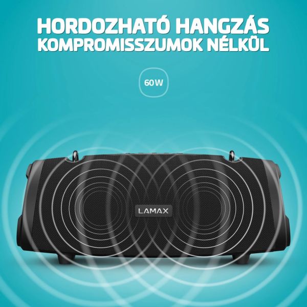 LAMAX Eclipse1 hordozható hangszóró, 60 W teljesítmény, kétirányú hangszórók, akkumulátor élettartama akár 9,5 óra, Bluetooth 5.3, automatikus párosítás, akár 5 állítható LED-effektus, FM rádió, különböző formátumok és csatlakozások támogatása, IPX6, USB-C, vállpánt.