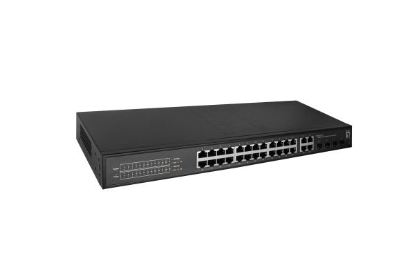 28xLAN port, LAN 10/100/1000 Mbps, 28xGigabit LAN, PoE port 16, SFP port 4, Menedzselhető, Rack, Fémház