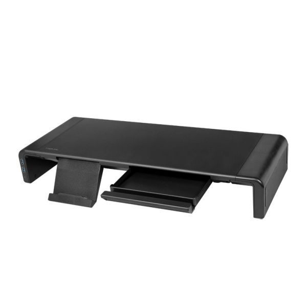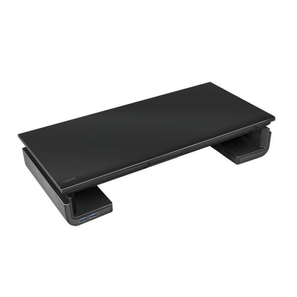 A tökéletes ergonomikus munkaterület! Az összecsukható szerkezet lehetővé teszi, hogy a szélességet (420/470/520 mm) az Ön igényei szerint állítsa be. Az emelő két USB 3.0 és egy USB-C porttal rendelkezik, így lehetővé teszi az adatátvitelt (a mellékelt USB 3.0 kábellel) és az okostelefon vagy táblagép töltését. A fém és műanyag állvány aljára billentyűzet és egér helyezhető. A LogiLink monitorállvány különlegessége a beépített fiókos kialakítás az okostelefon és iPad tartóval együtt. Így még a kisebb tárgyak is tisztán és rendezetten találják meg a helyüket.