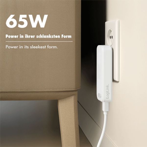 A LogiLink USB-C GaN 65W töltő egy ultravékony töltő, amelyet kifejezetten szűk helyekre fejlesztettek ki. Az innovatív GaN technológiának köszönhetően fizikailag kisebb és magasabb feszültséget bocsát ki, mint a szilícium alapú töltők, és jobb hőelvezetéssel rendelkezik. Mindössze 1,4 cm vastagságával ideális utazáshoz és keskeny aljzatokhoz.