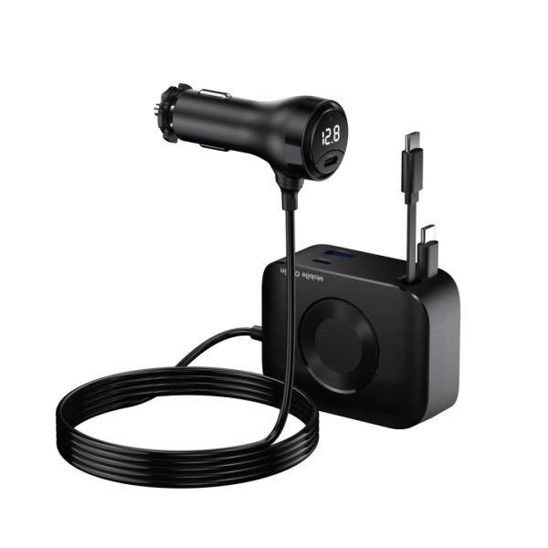 Univerzális és nagy teljesítményű 5 az 1-ben autós töltő, összesen 75 W teljesítménnyel, amely megoldja az egész utasok töltését. Két öntekercselő USB-C kábel és három további port (2x USB-C + 1x USB-A) kombinációjának köszönhetően egyszerre tudsz kiszolgálni a sofőrt, az első utast és a hátsó üléseken utazókat.