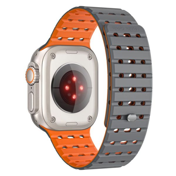Ez a kéttónusú szilikonszíj mágneses záródással és fém biztonsági csattal egyesíti a kényelmet, a stílust és a biztonságos illeszkedést sportoláshoz vagy mindennapi viselethez. Tartós, légáteresztő anyagból készült, gyengéd érzés a bőrön, és 200 mm-es csuklóig illik a csuklóhoz. Kompatibilis a 44-49 mm-es Apple Watch órával.