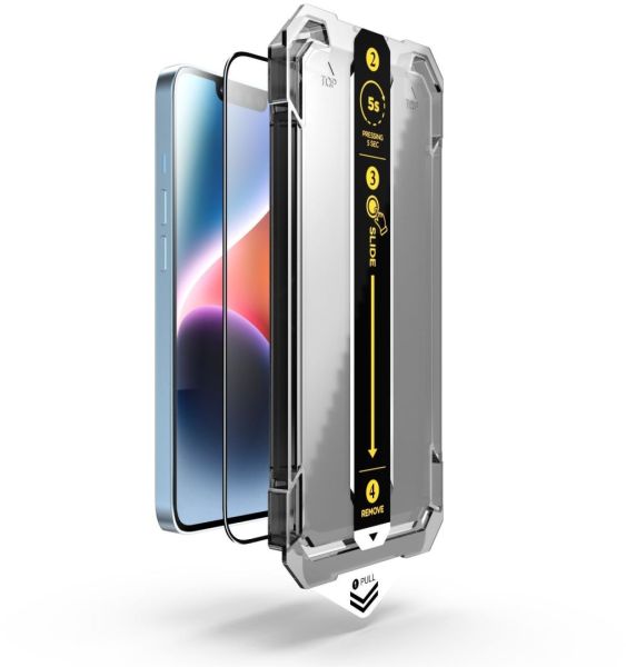 Üvegfólia - Apple iPhone 14 Plus és iPhone 13 Pro Max üvegfólia, 2.5D ívelés, 9H keménységgel, 0,3 mm üvegvastagsággal, a csomag részét alkotja: szerelőkeret, törlőkendő, alkoholos kendő, poreltávolító matrica és telepítőfólia