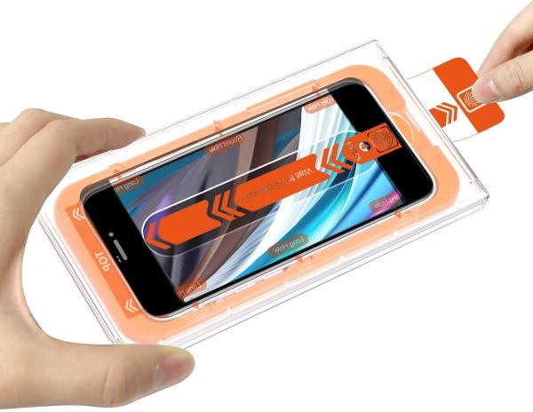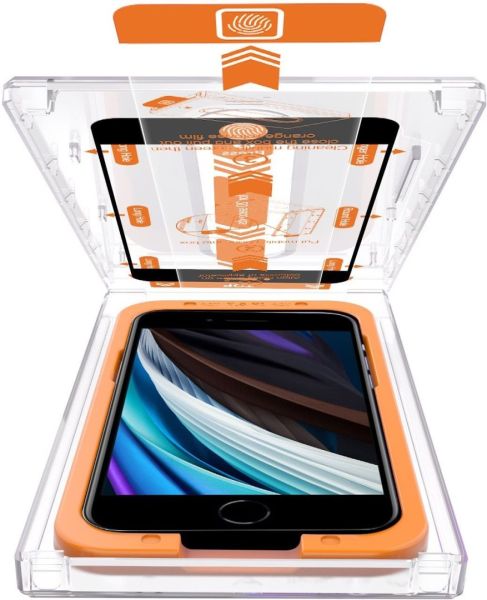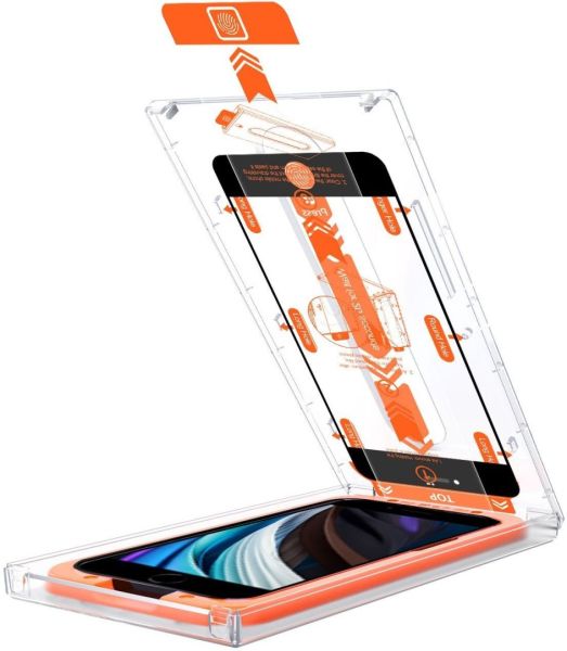 Üvegfólia - Apple iPhone 7, iPhone 8, iPhone SE (2020) és iPhone SE (2022) üvegfólia, 2.5D ívelés, 9H keménységgel, 0,3 mm üvegvastagsággal, a csomag részét alkotja: szerelőkeret, törlőkendő, alkoholos kendő, poreltávolító matrica és telepítőfólia.