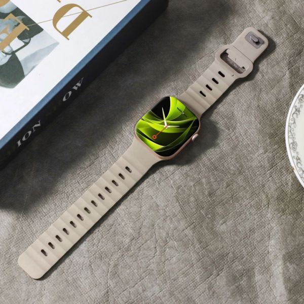 Fluororgumi szíj fémcsattal, amely kényelmet, stílust és biztos illeszkedést biztosít sportoláshoz és mindennapi viselethez. A tartós és légáteresztő anyag bőrbarát és 200 mm-es csuklóig alkalmas. Kompatibilis a 44-49 mm-es Apple Watch órával.