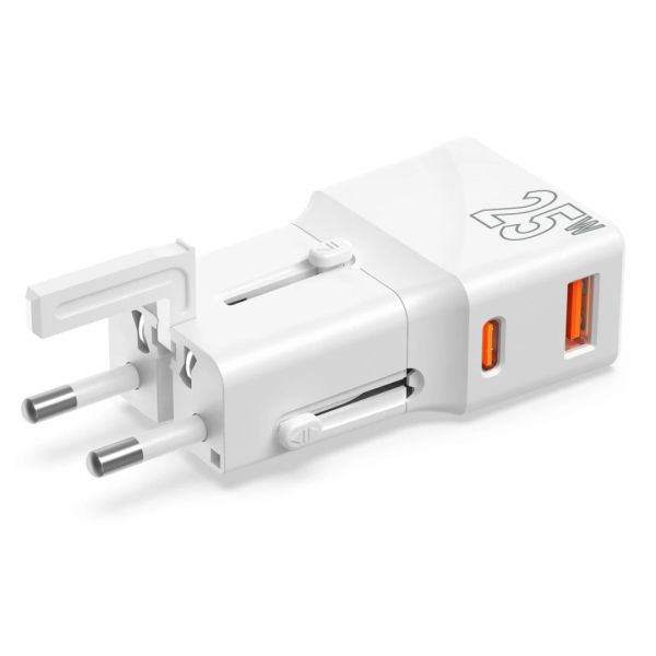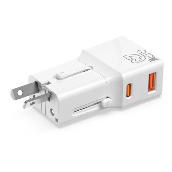 Univerzális utazási adapter PD+QC 25W töltővel és beépített aljzatokkal a világ több mint 200 országába.