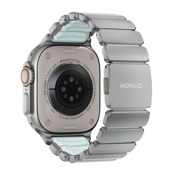 A Nomad Stratos Band Titanium egy prémium hibrid Apple Watch szíj, amelyet mindennapi viseletre, valamint sportoláshoz és szabadtéri kalandokhoz terveztek. Ötvözi a 4. fokozatú titán láncszemek kifinomultságát az FKM kényelmével és rugalmasságával. A titán külső rész erősséget és kifinomult matt felületet biztosít, míg az FKM belső elemek kényelmet, vízállóságot és természetes mozgást garantálnak.