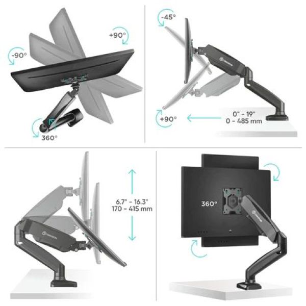 Támogatja a fel-le billentést +90° és -45° között, a balról jobbra 180°-os és 360°-os elforgatást. Forgassa el fekvő vagy álló nézetbe, és rögzítse bármely pozícióban a szeme magasságában. A hajlékony kar akár 19,1" hosszúságúra is kinyúlhat, és 16,3" magasságra emelkedhet.