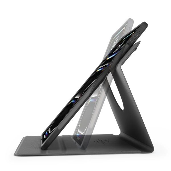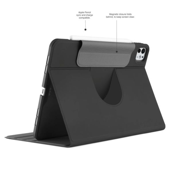 Nyisd ki a biztonságos mágneses fedelet, hogy az iPadet elfordíthasd álló vagy fekvő helyzetbe, így egy 2 az 1-ben iPad-állványt kapsz, amely előre és hátra is állítható, hogy a megfelelő nézési pozíciót érd el, akár az ágyban nézed a Netflixet, akár egy kihangosított FaceTime-hívásra van szükséged.