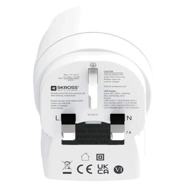 A SKROSS® Europe to UK USB megbízható és egyszerű csatlakozást biztosít Schuko vagy Euro dugós európai eszközöknek a brit (UK) aljzatba. Biztonságosan támogatja a nagyobb teljesítményű készülékeket is (pl. laptop, hajszárító), miközben két USB-eszköz egyidejű töltését is lehetővé teszi (USB-A + USB-C).
