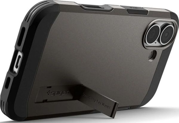 A beépített MagSafe mágneses gyűrű stabil és biztonságos rögzítést biztosít az Apple tartozékokhoz, például vezeték nélküli töltőkhöz, autós tartóhoz vagy mágneses tárcákhoz. Ez a megoldás lehetővé teszi a MagSafe rendszer teljes funkcionalitását anélkül, hogy a készülék védelme sérülne. A Tough Armor "T" tok masszívabb, mégis ergonomikus kialakításával tűnik ki. Jellegzetes, összecsukható állvánnyal van ellátva, amely lehetővé teszi a telefon kényelmes vízszintes elhelyezését, ami tökéletes filmnézéshez vagy videohívásokhoz. A képernyő és a kamera körüli megemelt élek védik a legérzékenyebb elemeket, míg a precíz kivágások és az érzékeny gombok teljes körű könnyű kezelhetőséget biztosítanak.