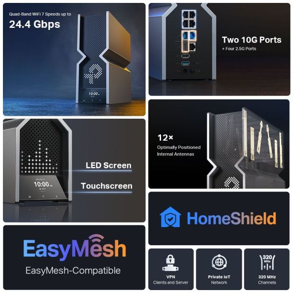A WiFi routerek újradefiniálása: Erőteljes WiFi 7 teljesítménnyel, villámgyors vezetékes kapcsolatokkal, vadonatúj dizájnnal, valamint egyszerűen használható érintőképernyővel és LED-kijelzővel.