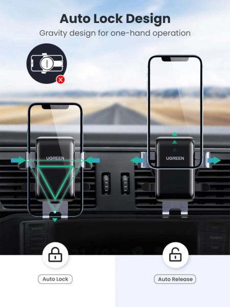 - Gravitációs zár: A gravitációs mechanikával ez az UGREEN autós telefontartó lehetővé teszi az automatikus rögzítést és az automatikus kioldást. A masszív bölcső szilárdan tartja a telefont útközben.