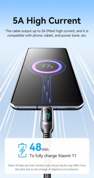 A Vention TAYBAV TAYBAV kábel intelligens LED kijelzővel van felszerelve, amely valós idejű információkat nyújt a töltési sebességről és a leadott teljesítményről. Ez megkönnyíti a töltési folyamat nyomon követését és a hatékonyság optimalizálását. Ezenkívül a kábel automatikusan túltöltésvédelmi üzemmódba kapcsol, amikor az akkumulátor közeledik a teljes töltöttséghez, így a kábelt hosszú időre is biztonságosan bedugva hagyhatja.