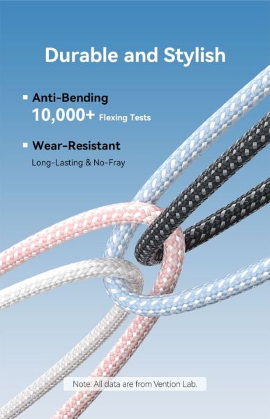 A Vention kábel egyik fő előnye a robusztus kialakítás. A PVC és a pamutfonat biztosítja a kopásállóságot, a megerősített végek pedig megvédik a kábelt a sérülésektől még erős igénybevétel esetén is. Ennek eredményeként a kábel ellenáll a hajlításnak és a kopásnak, amit a több mint 30 000 hajlítással végzett tartóssági tesztek is megerősítenek.
