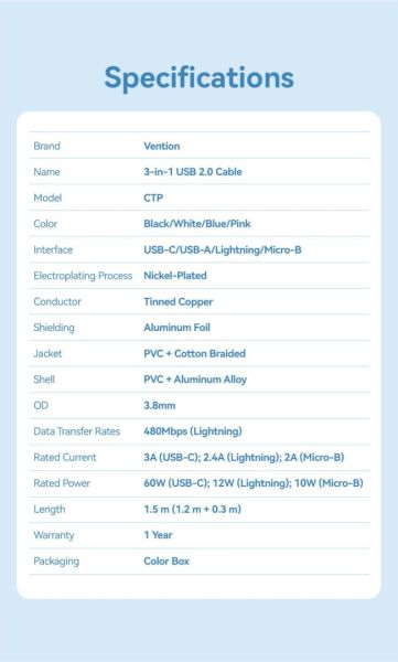 Az USB 2.0 A - 3in1 3A Vention CTPLG 1,5M kábel egy sokoldalú megoldás, amely lehetővé teszi, hogy különböző eszközöket töltsön és szinkronizáljon egyetlen kábellel. Három különböző csatlakozóval - Lightning, USB-C és Micro-B - felszerelve tökéletes lesz a modern okostelefonok, valamint a régebbi eszközök, például powerbanks és fényképezőgépek töltésére.