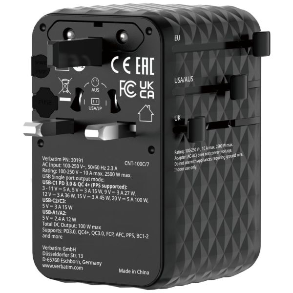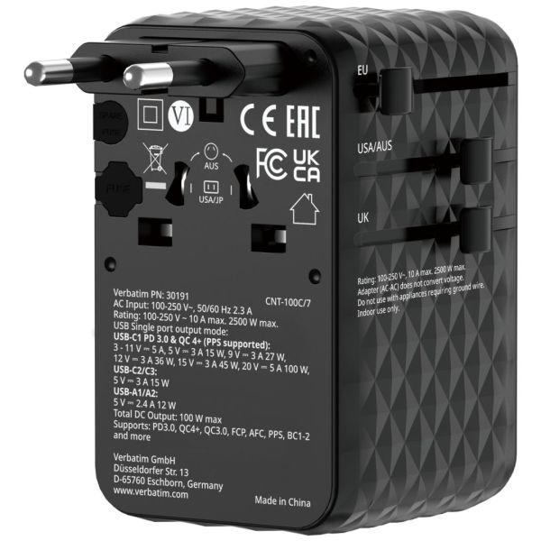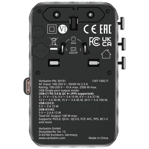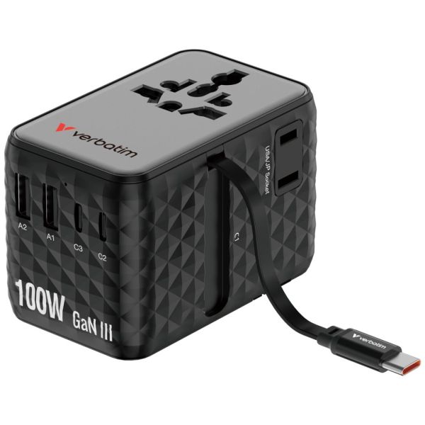 Verbatim Charge 'n' Travel 100W GaN III Universal Travel Adapter with Retractable USB-C Cable Black